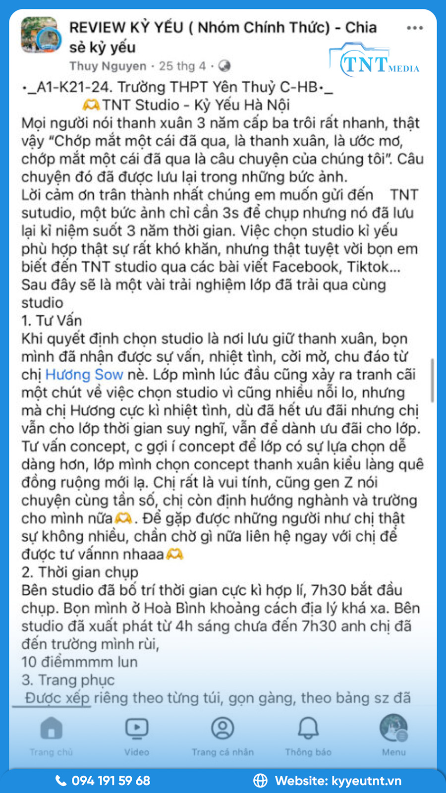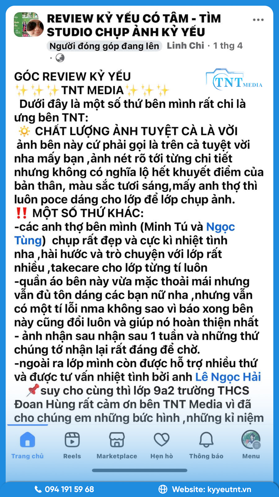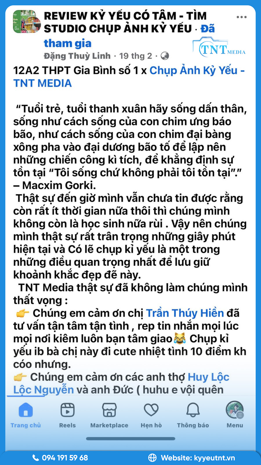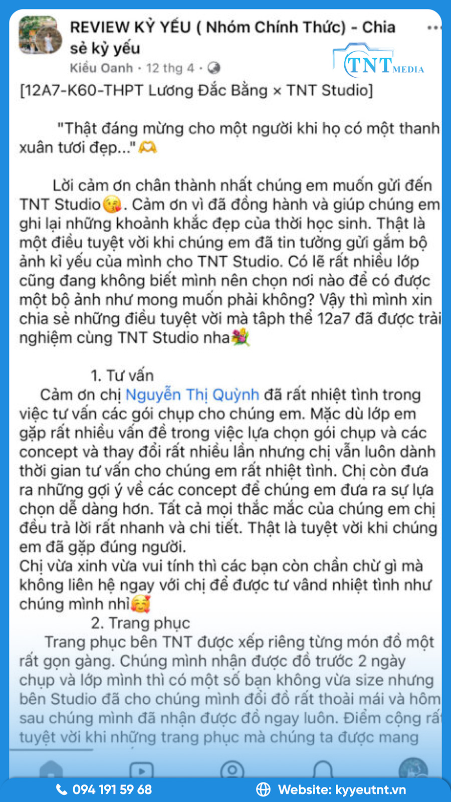 ” Em cảm ơn Studio TNT rất nhiều vì đã cho lớp em một chuyến đi chụp kỉ yếu thật nhiều ý nghĩa. Vui có buồn cũng có , thật nhiều thứ khó quên. Các anh tận tình nhiệt huyết với các em và nhây nữa. Sẽ rất khó để chúng em có thể quên đi, rất nhiều cảm xúc khó tả , mệt nhưng mà rất là vui. Các anh thợ chụp rất là tận tình chỉ bảo các em cách tạo dáng. Em chúc studio mình sẽ có nhiều hợp đồng trong tương lai để cho nhiều lớp sẽ có kỉ niệm đẹp tuổi học trò. #TNTMAIDINH”
