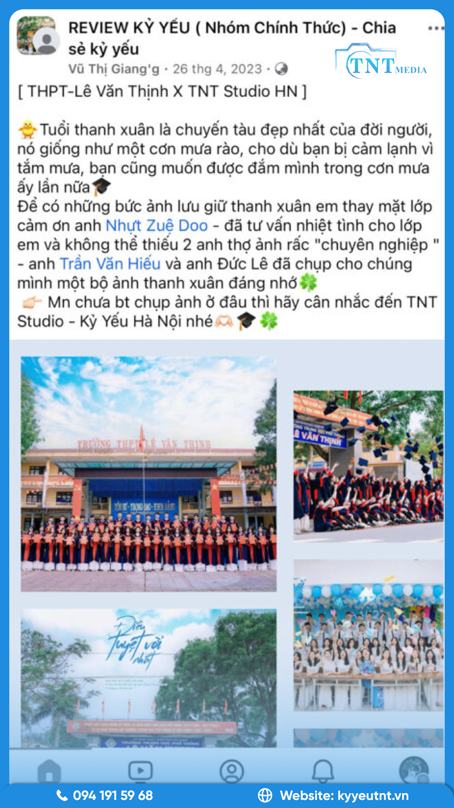 ” Cảm ơn TNT Studio – Kỉ yếu Hà nội đã giúp chúng tôi lưu lại những khoảnh khắc thanh xuân đáng nhớ. Và để có được những tấm ảnh đẹp,chất độc đáo thì phải kể đến công sức của 2 anh thợ chụp ảnh anh Hoàng và anh Hưng. Các anh tư vấn nhiệt tình,thân thiện,làm việc hết mình để chúng tôi có những bộ ảnh đẹp nhất. TNT quả là một lựa chọn sáng suốt, tin cậy cảm ơn TNT rất nhiều ạ”