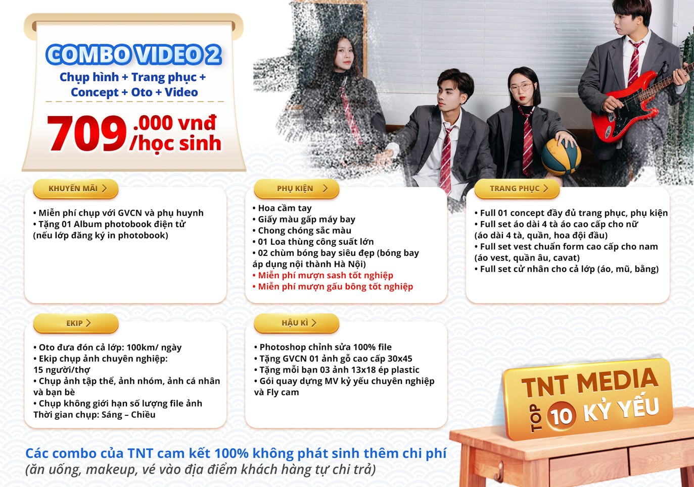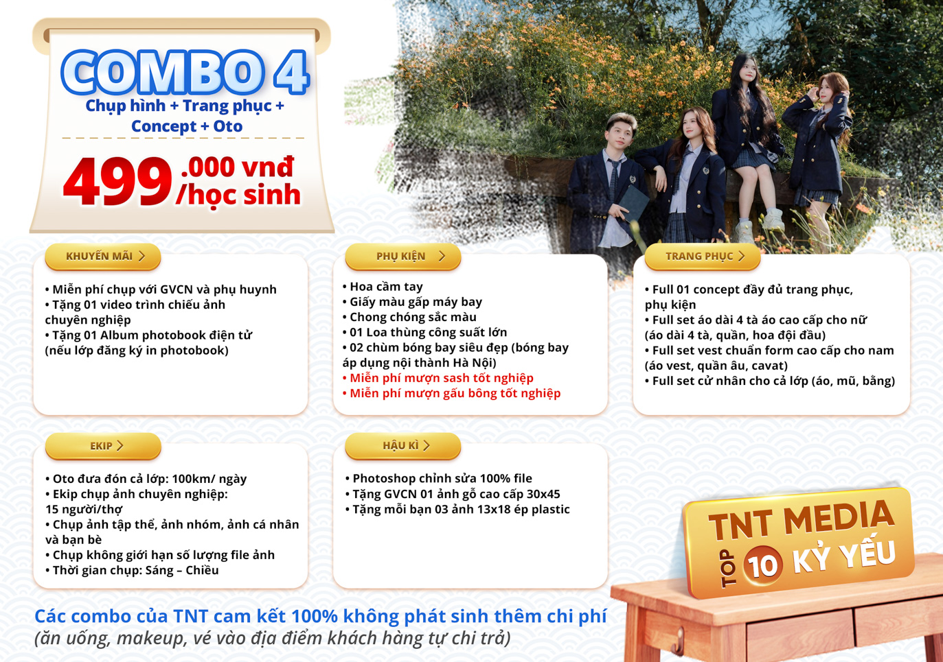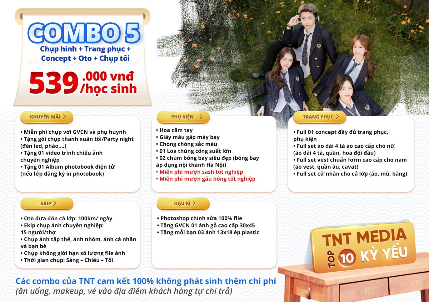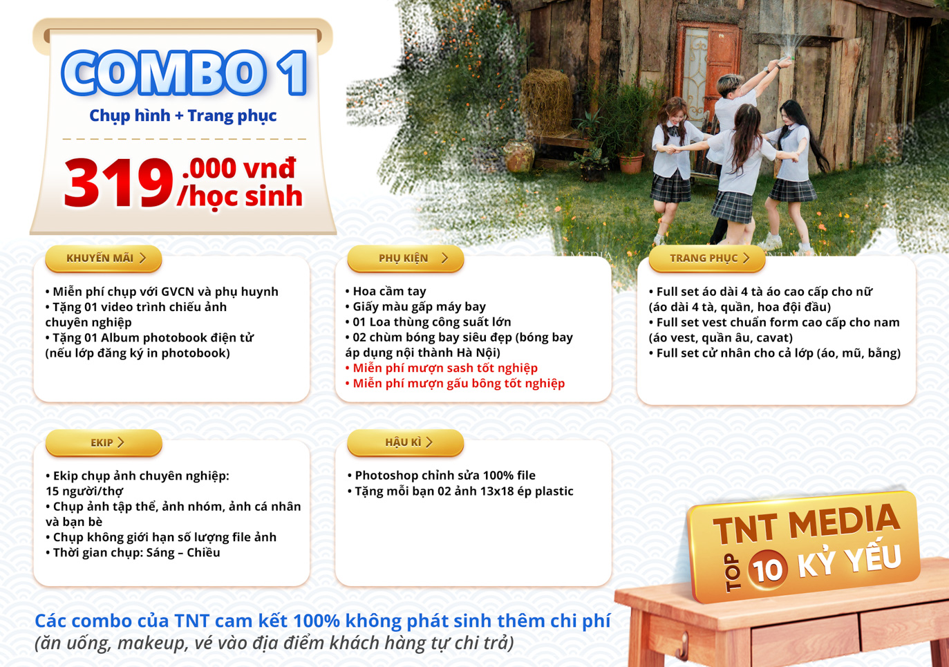 TNT trân trọng gửi tới quý khách hàng bảng báo giá combo chụp ảnh kỷ yếu với nhiều ưu đãi hấp dẫn.