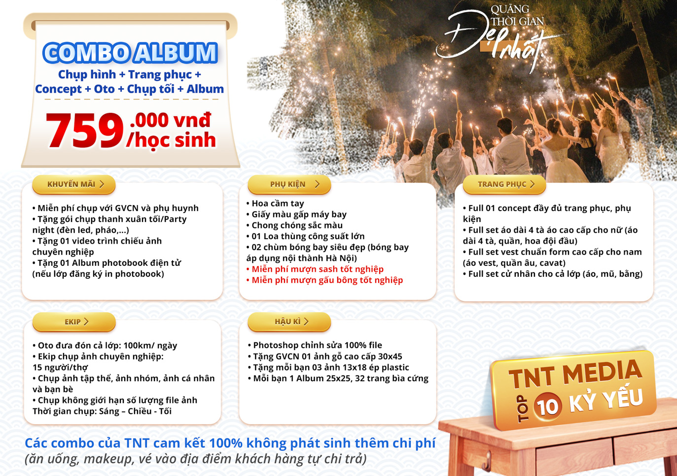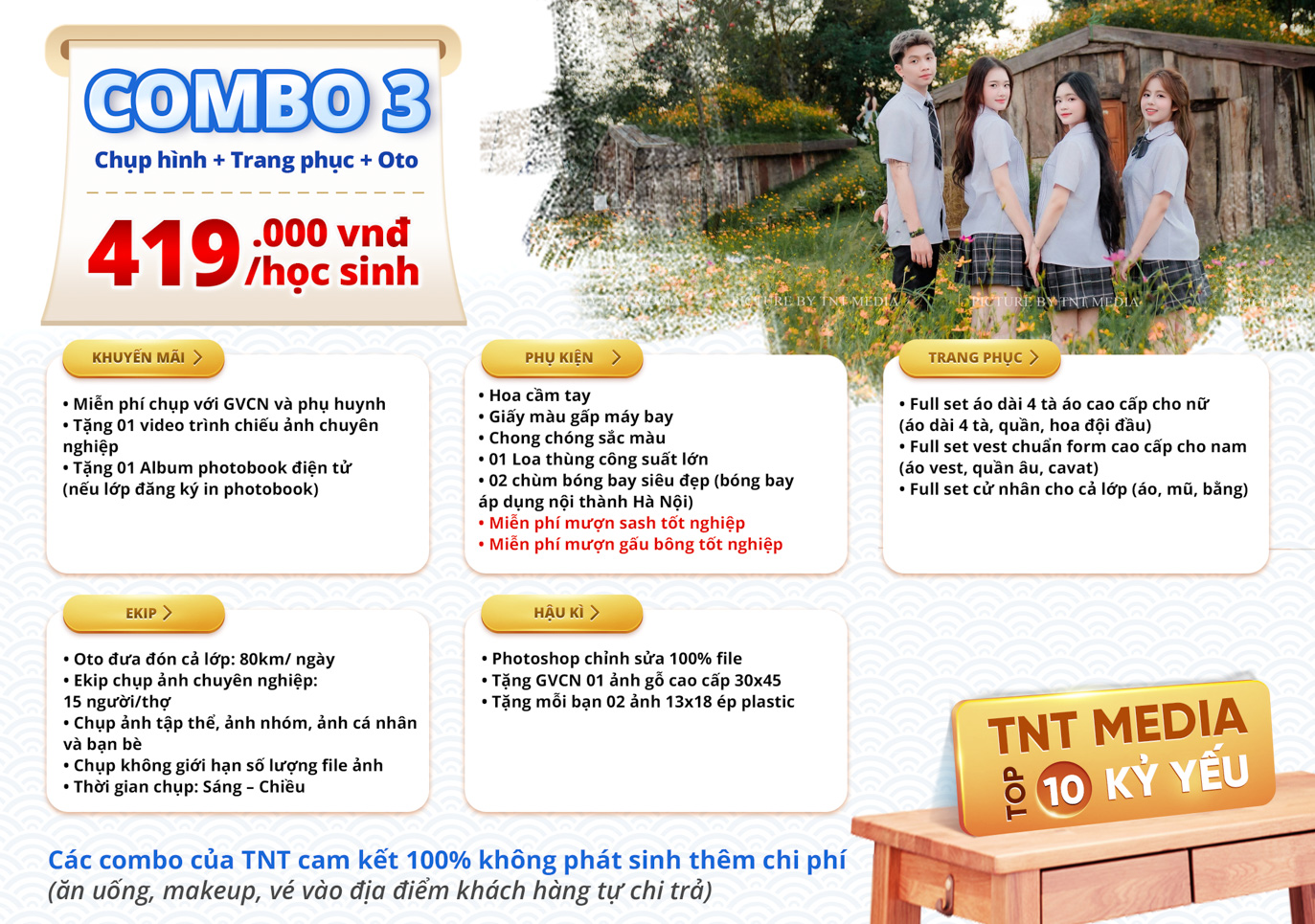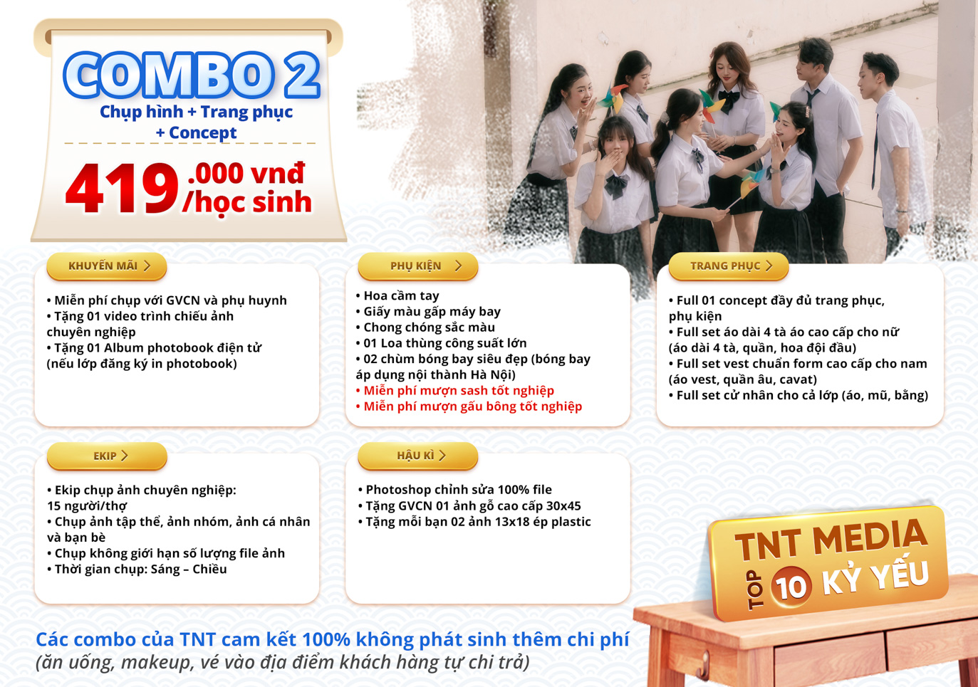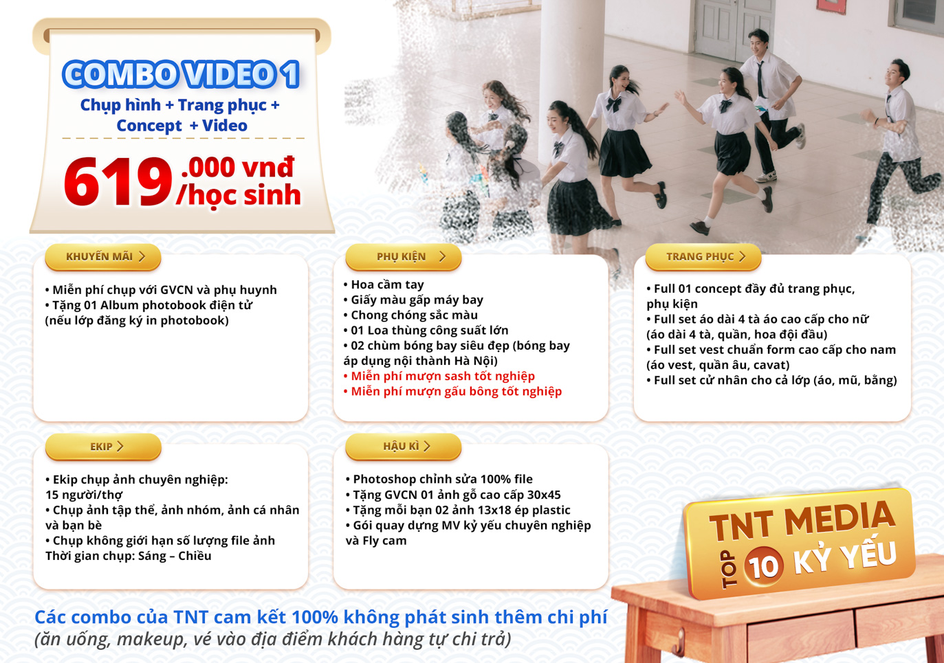 TNT trân trọng gửi tới quý khách hàng bảng báo giá combo chụp ảnh kỷ yếu với nhiều ưu đãi hấp dẫn.